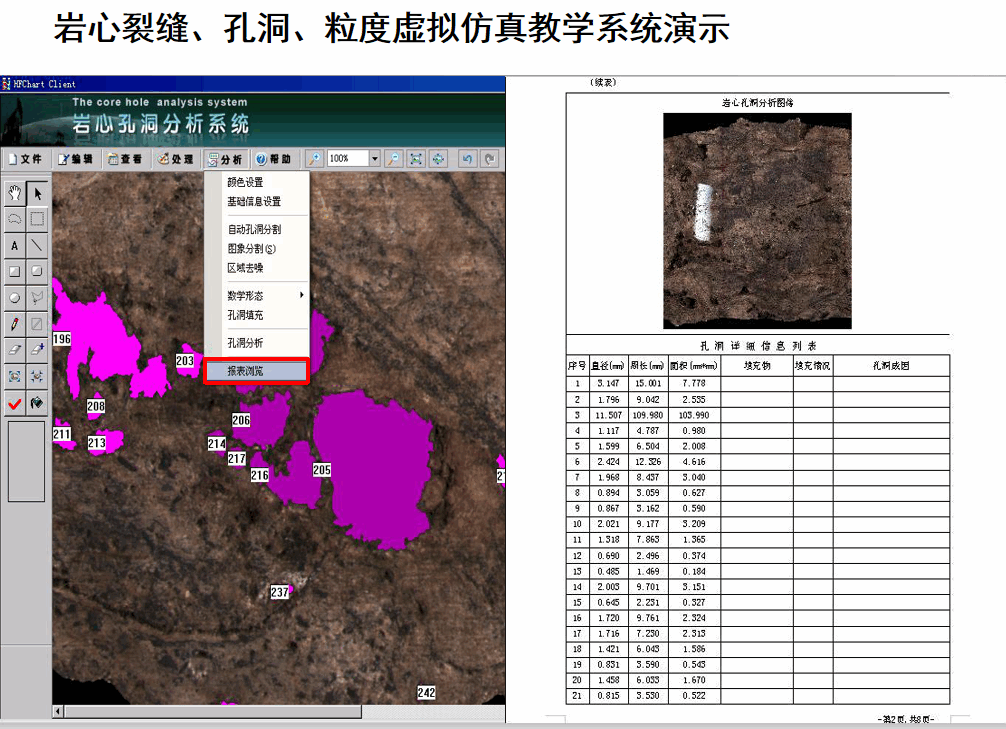 傳統(tǒng)實驗由老師手持巖心實物、指導(dǎo)學(xué)生觀察、描述巖心。由于巖心實物匱乏,教學(xué)素材極其有限。通過虛擬仿真技術(shù),可以通過各大油田巖心庫收集國內(nèi)外巖心實物的數(shù)字圖像,結(jié)合計算機技術(shù)實現(xiàn)巖心孔洞、裂縫、粒度虛的擬仿真教學(xué)。通過數(shù)字圖像處理技術(shù)對巖心圖像進行預(yù)處理,快速確定裂縫的邊界,達(dá)到巖心圖像處理和人機交互方式。研究巖心孔洞、裂縫、粒度圖像分析技術(shù),實現(xiàn)了自動提取孔洞、裂縫、粒度目標(biāo),自動統(tǒng)計計算相關(guān)參數(shù),并結(jié)合試驗室常規(guī)物性測試和測井資料進行參數(shù)分析評價,從而解決了以往人工測定,測量數(shù)值存在較大誤差,而且費工費時,轉(zhuǎn)化參數(shù)難度大等問題,深化了對巖心這一地質(zhì)基礎(chǔ)資料的應(yīng)用,對于裂縫、孔洞型油氣藏的勘探與開發(fā)具有重要意義。